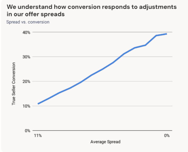 My $0.02 is that Kaz is going to aim for the fences and bring spreads down VERY significantly. I always come back to this chart which outlines seller conversion vs. spread. Ironically, it doesn't really even go above 10% since the company didn't have great data for offers that high at the time (2021 / 2022). However, if I totally eyeball it - at 15% spreads - it seems likely that true seller conversion was probably about low to mid-single digits. At 6% spreads, that number looks closer to 25% (or a 5x increase). That means Kaz has a clear growth knob to turn (price) where he could easily double or triple volumes just by bringing spreads in to a more reasonable range.