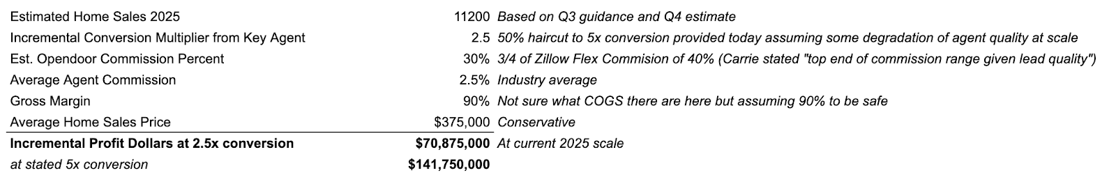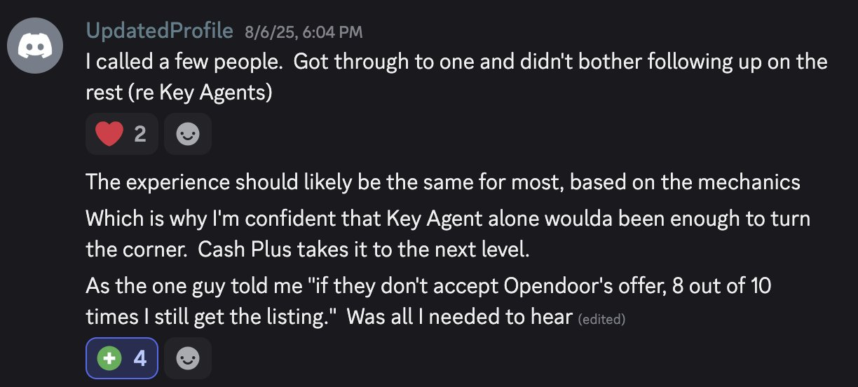 For those who don't follow me on X, a Datadoor member UpdateProfile did some diligence, actually talked to a Key Agent and came away very bullish. It seems like once the agent has built the relationship with the Opendoor lead, there's stickiness there ("8 out of 10 times I still get the listing") - which means, with Opendoor's Cash Offer, it's essentially $$$ in the bank for the agent - hence Opendoor's "top-end" commission take.
